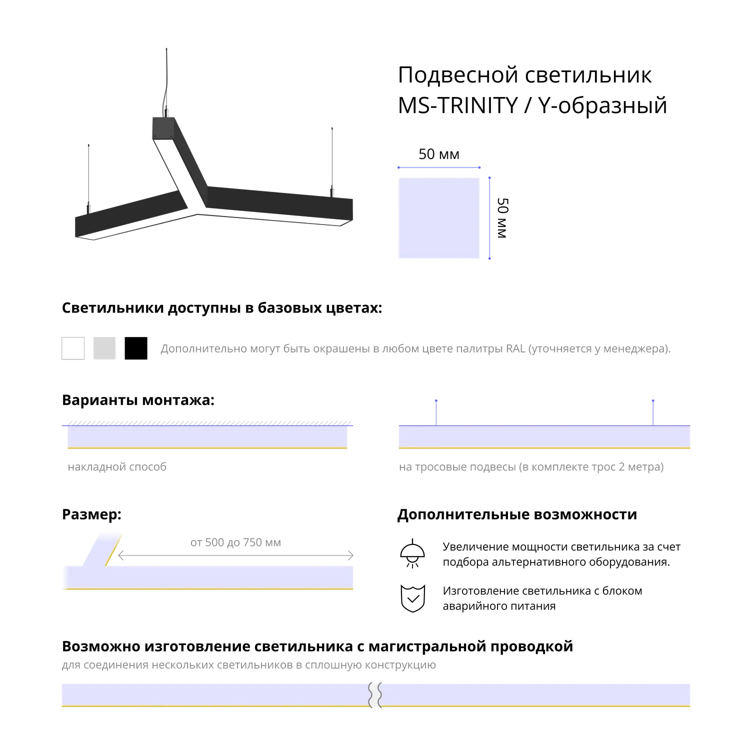 Cветодиодный фигурный светильник MS-TRINITY Y-образный – это стильное и функциональное решение для освещения вашего пространства. Размер профиля 50x50 мм и длина 3х500 мм обеспечивают равномерное распределение света, создавая уникальную и привлекательную атмосферу в любом помещении.