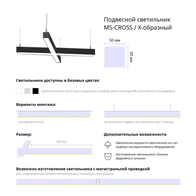 X-образные профильные светильники MS-Line – это инновационное решение для создания функционального и эстетичного освещения в помещениях с высокими потолками. Производимые в России из высококачественного алюминиевого профиля толщиной не менее 3 мм, эти светильники сочетают в себе надежность, долговечность и привлекательный дизайн. Гарантийный срок в 5 лет подтверждает их качество и стабильность работы.