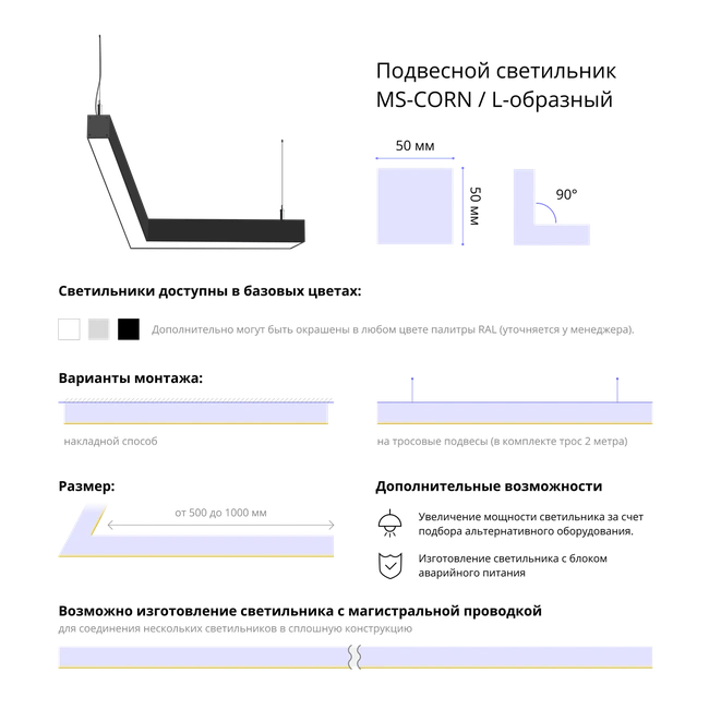 Представляем вам уникальный светодиодный подвесной фигурный светильник MS-CORN L-образный 90° – стильное и функциональное решение для освещения вашего пространства. Размер профиля 50х50 мм, длина 1000х1000 мм обеспечивают равномерное распределение света, создавая приятную и уютную атмосферу в любом помещении.