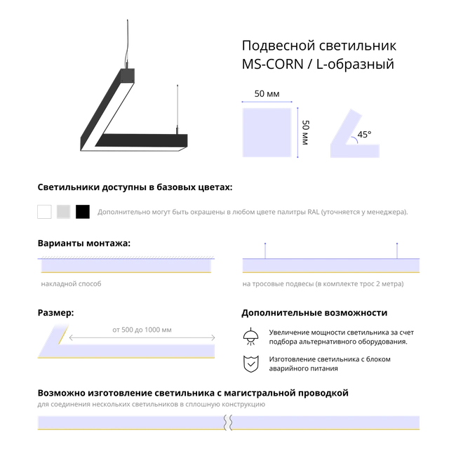 Представляем вам уникальный светодиодный подвесной фигурный светильник MS-CORN L-образный 45° – стильное и функциональное решение для освещения вашего пространства. Размер профиля 50х50 мм, длина 1000х1000 мм обеспечивают равномерное распределение света, создавая приятную и уютную атмосферу в любом помещении.