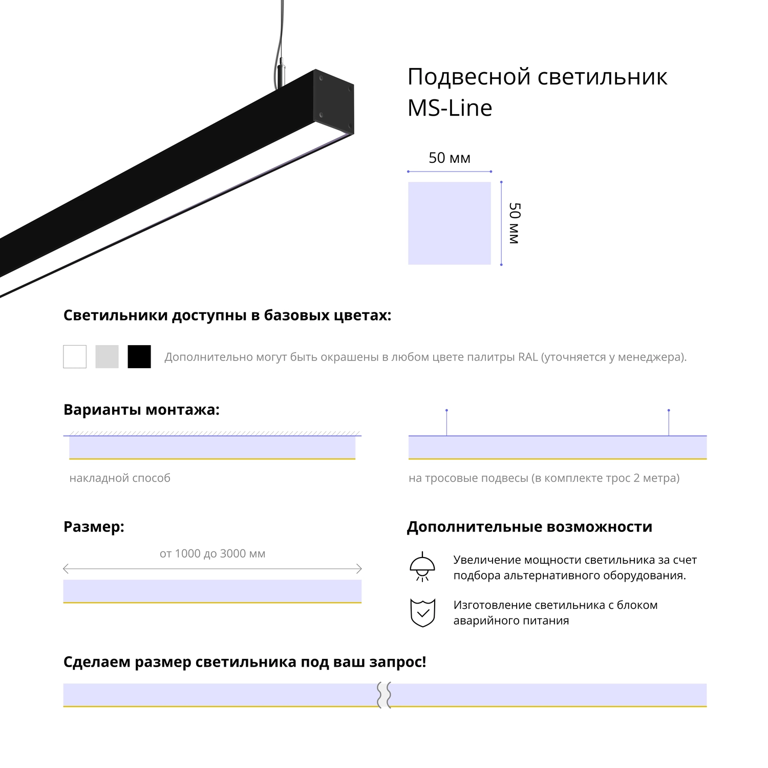 Подвесной линейный светодиодный светильник MS-LINEAR – это идеальное сочетание стиля, функциональности и надежности. Выберите подходящий вариант для вашего интерьера и наслаждайтесь качественным освещением каждый день.